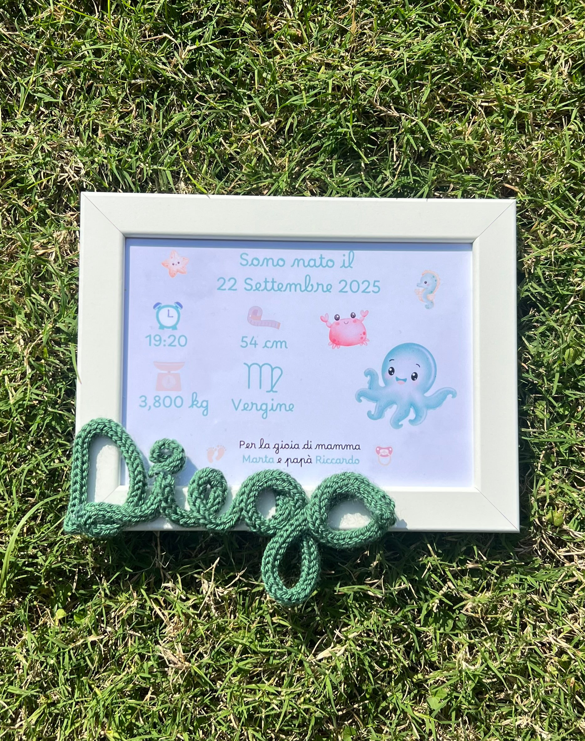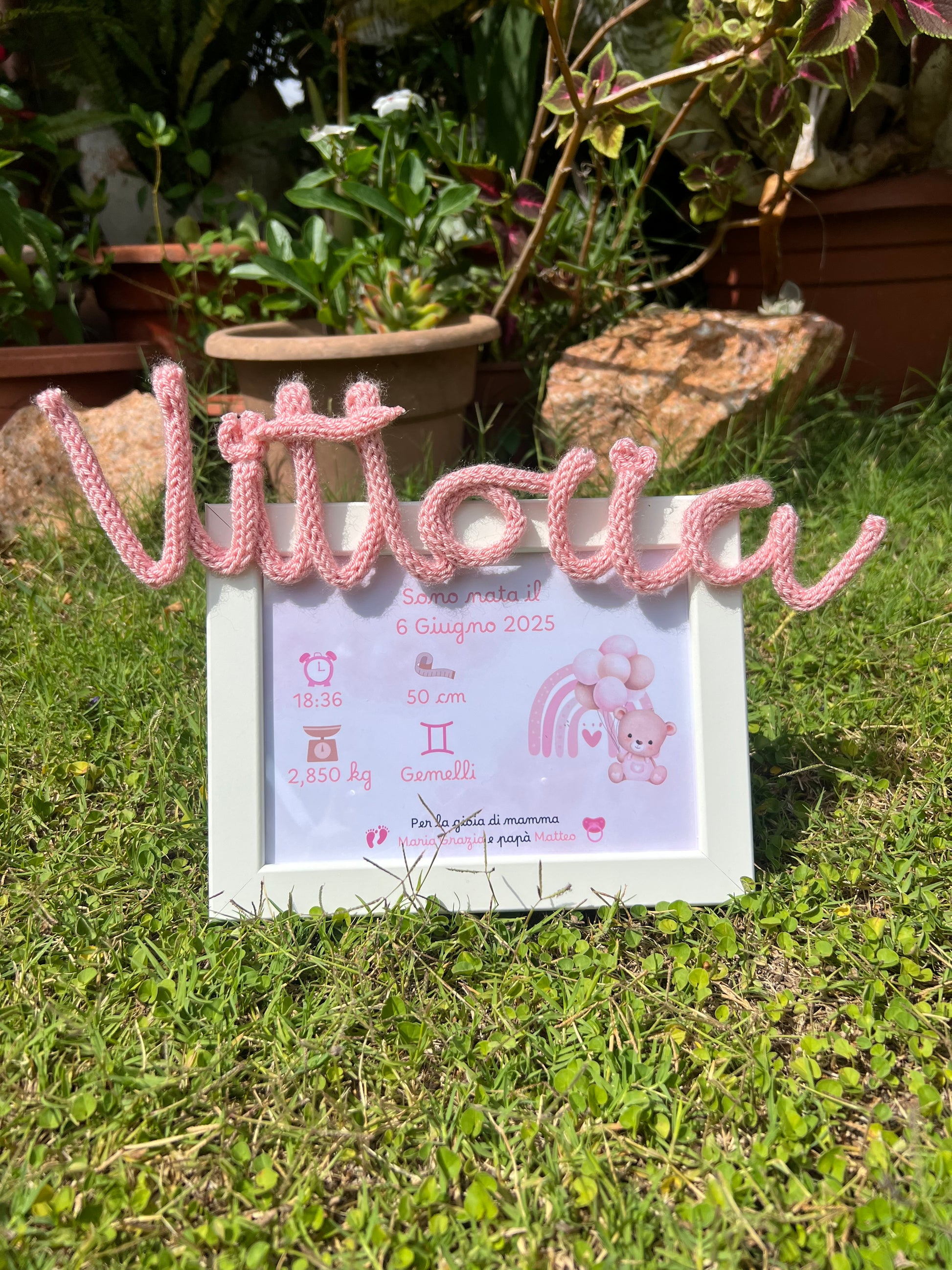 Ogni dettaglio è pensato per rendere il quadretto un pezzo unico: colori personalizzabili, decorazioni su misura e possibilità di aggiungere data di nascita, peso, altezza e orario.